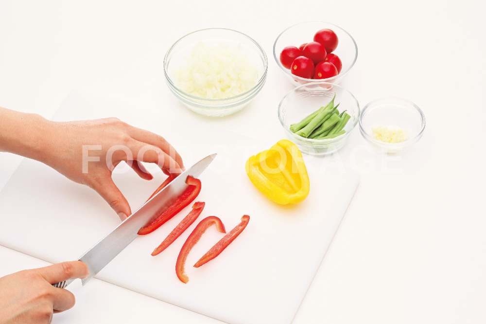 玉ねぎ、にんにくはみじん切り。ミニトマトはヘタを取り除く。パプリカはヘタと種を取って細切り、さやいんげんは3等分に切る。 |