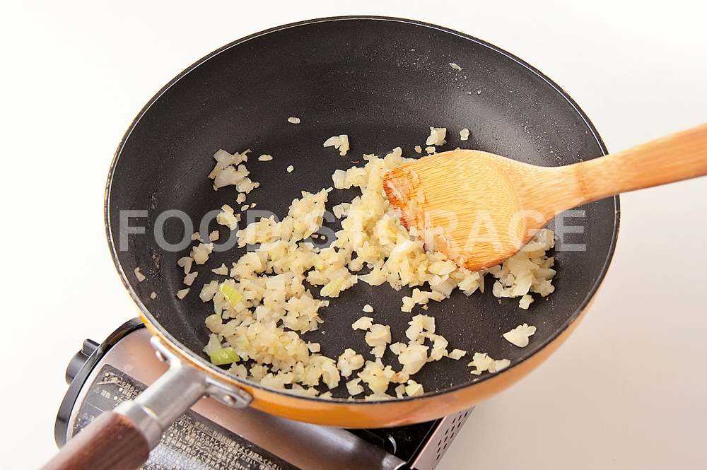 4のフライパンに残りのオリーブを入れ、2の玉ねぎ、にんにくを加えてしんなりするまで中火で炒める。 |