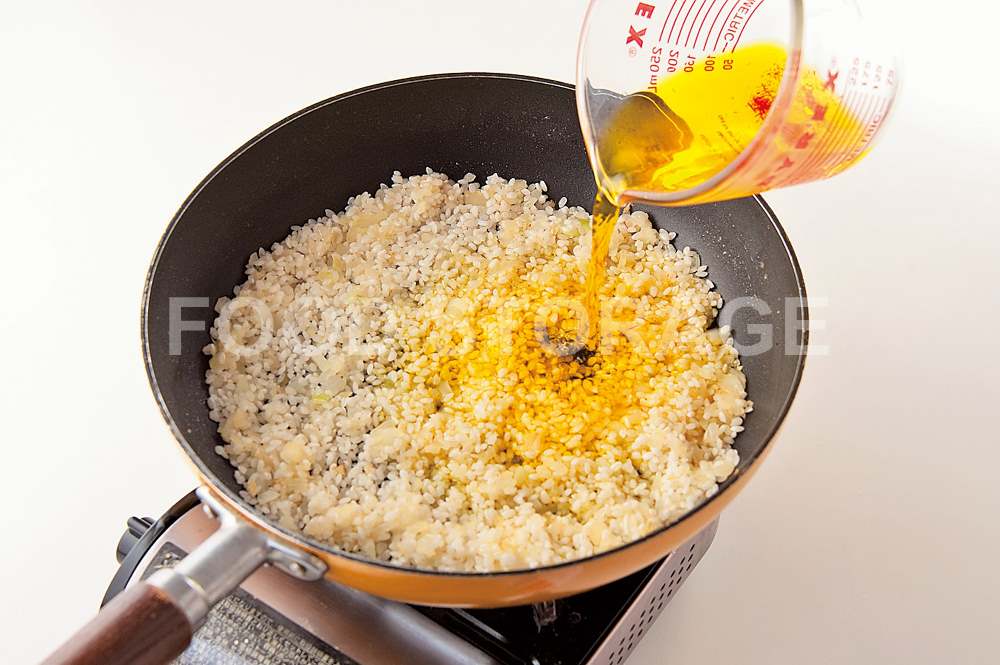 ポイント:油につけてサフランの香りと色をしっかり出す。 |