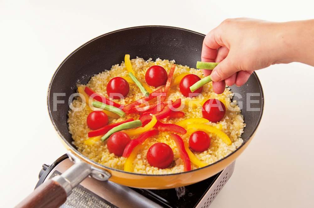 米を加え、米が透明になるまで炒め合わせる。Aを加えて混ぜ、火を止めて平らにならす。 |
