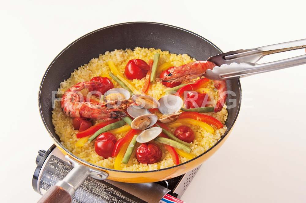 えびとあさりを入れ、中火でご飯の底がカリッとするまで加熱して、くし形切りのレモンを添えてフライパンのまま食卓へ出す。 |