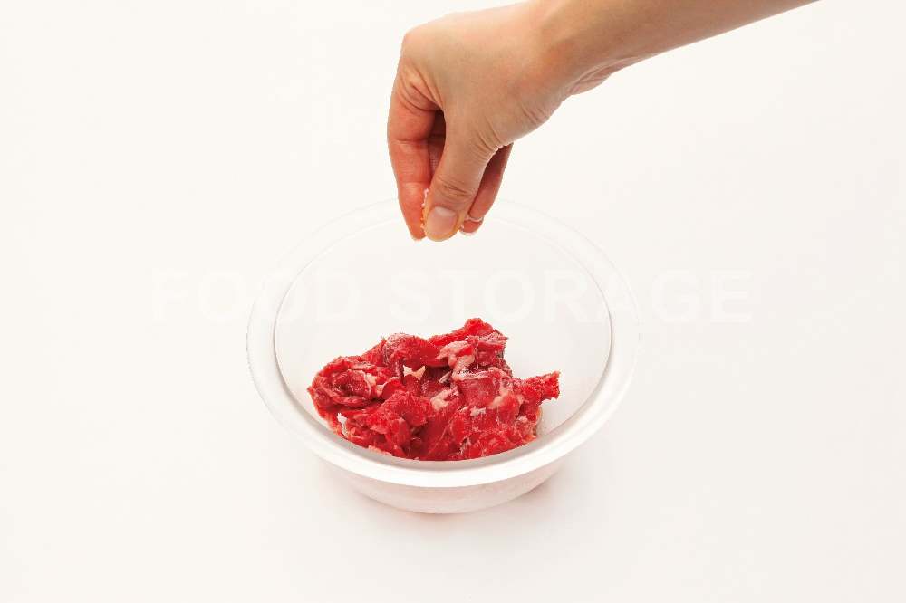 牛こま切れ肉は酒、塩をふって下味をつける。 |