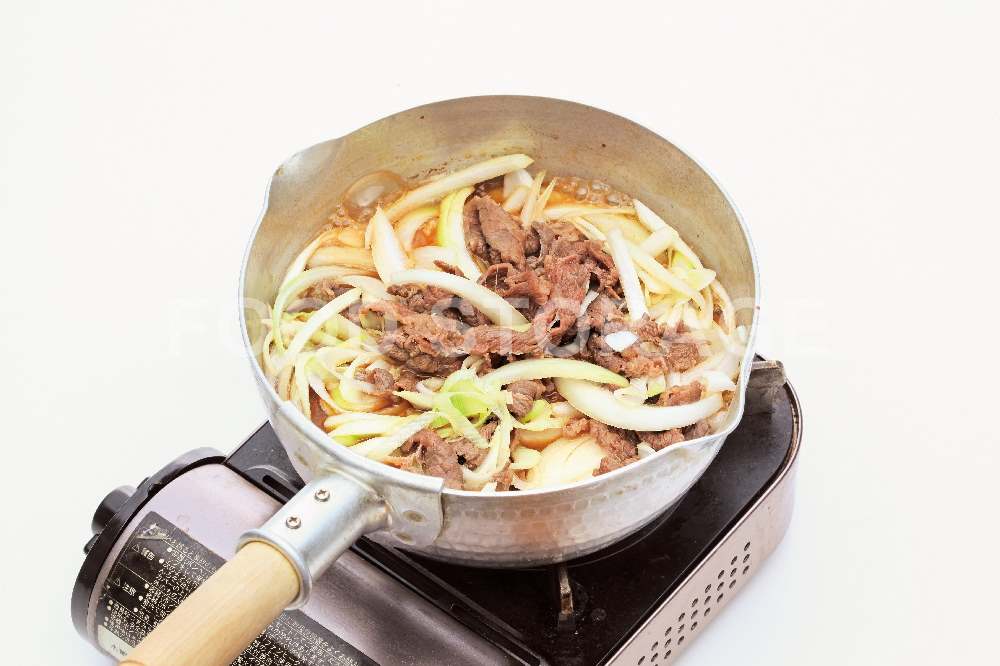 玉ねぎは繊維に沿って5~6mm幅の薄切りにし、長ねぎは斜め薄切りにする。 |