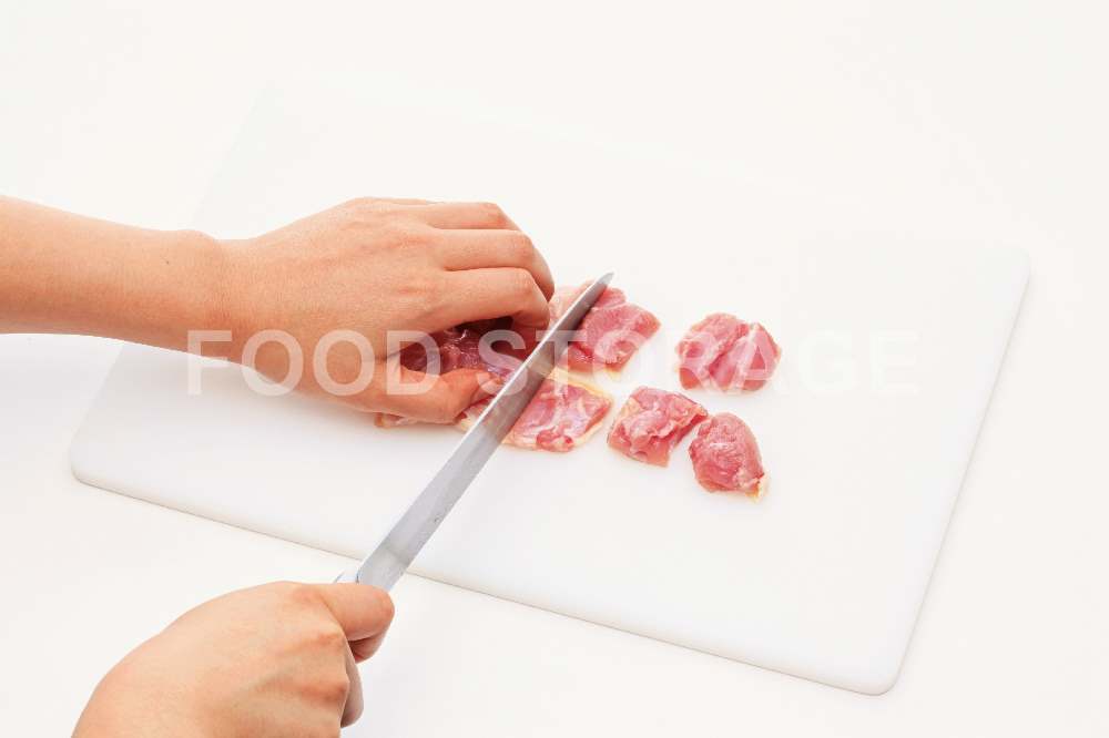 鶏もも肉は横に2等分に切ってから一口大に切る。 |