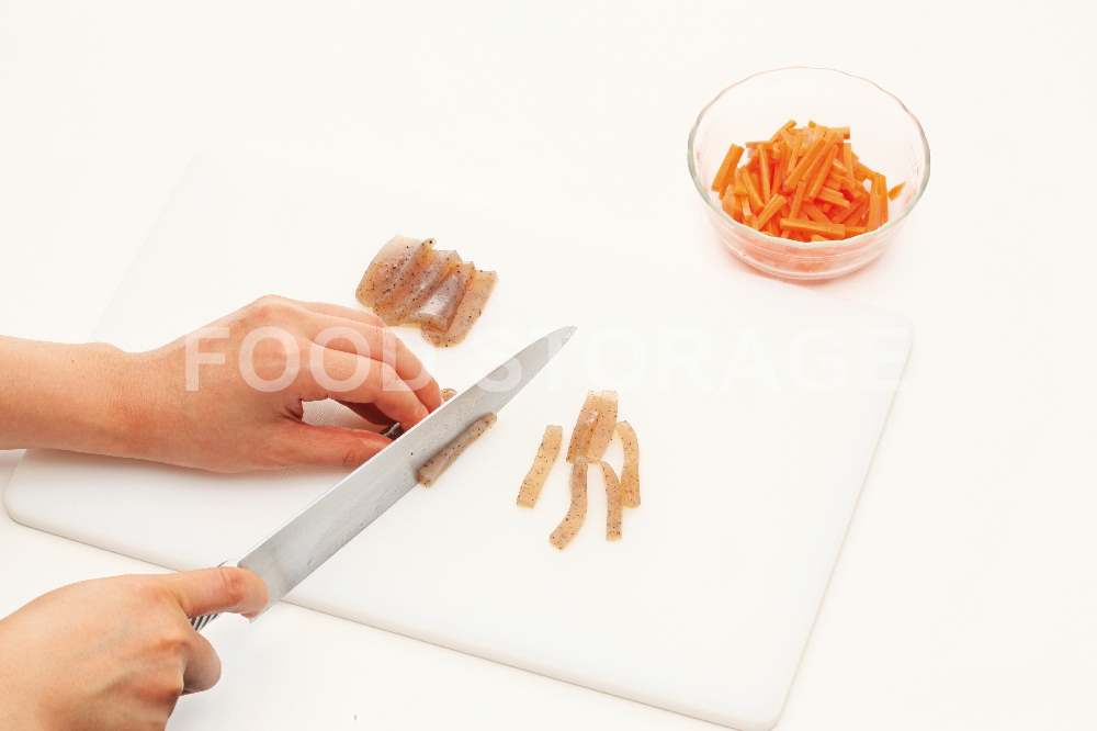 にんじん、こんにゃくは3cm長さの細切りにする。 |