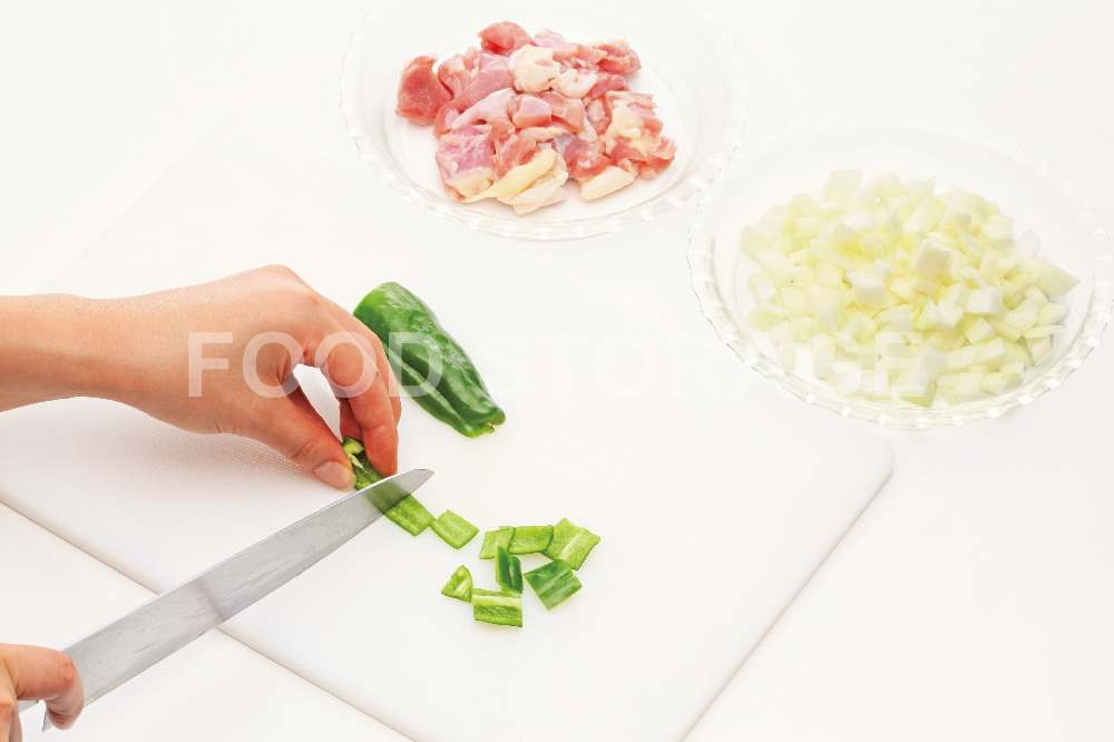 鶏もも肉は2cm角に切り、玉ねぎ、ピーマンは1cm角に切る。 |