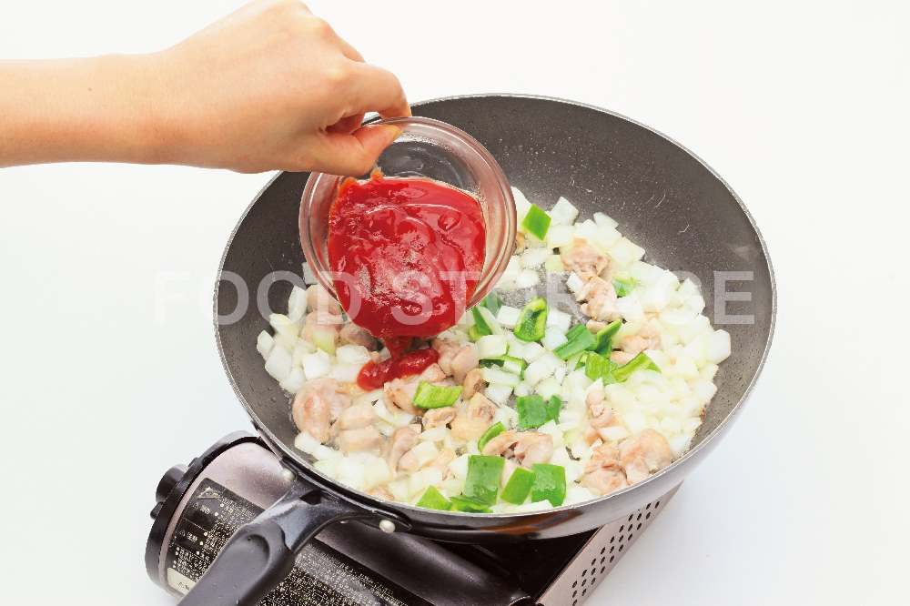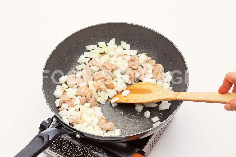 フライパンにサラダ油を熱して1の鶏肉を炒め、焼き色がついたら玉ねぎを加えて炒め合わせる。 |