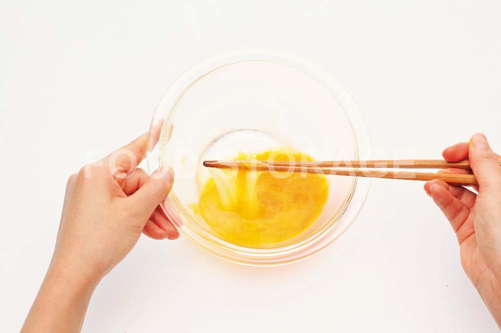 ボールに卵2個を割り入れ、泡立てないようにざっとかき混ぜ塩、こしょうで味を調える。 |
