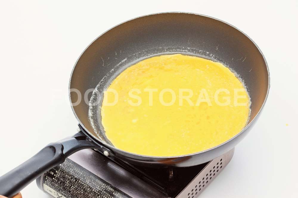 フライパンを中火にかけて半量のバターを溶かし、5を流し入れて前面に広げる。 |