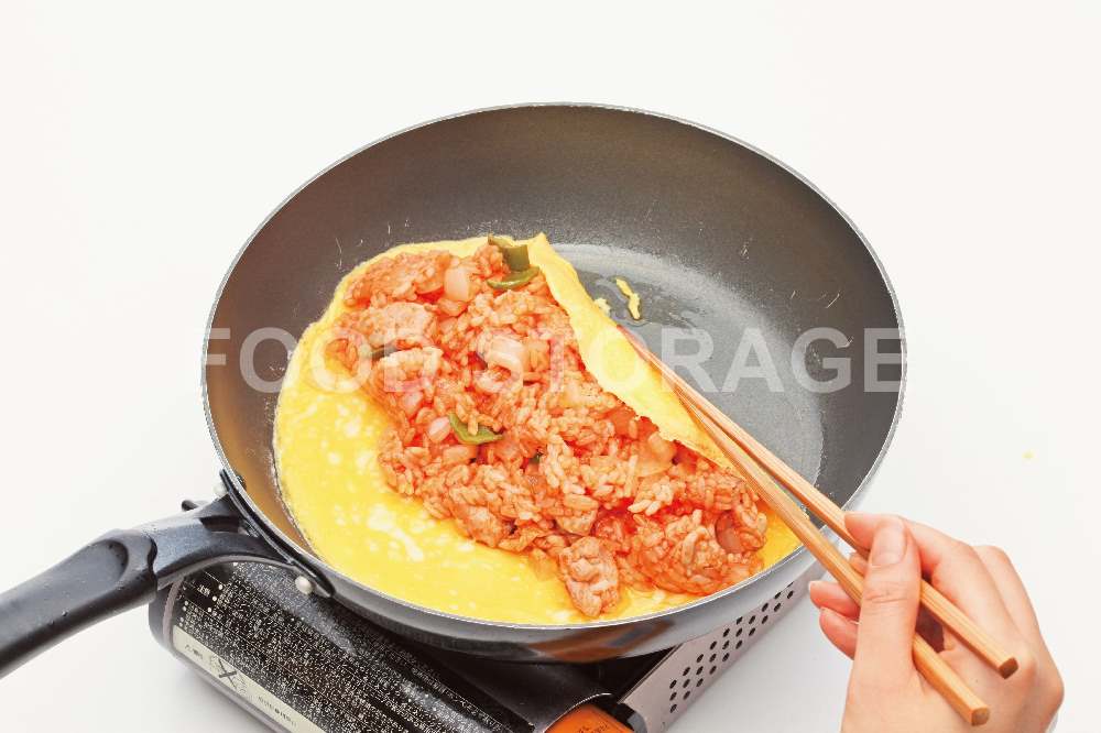 卵の表面が乾く前に、4の半量を中央に置いて菜箸で卵を両側から寄せて器に盛る。 |