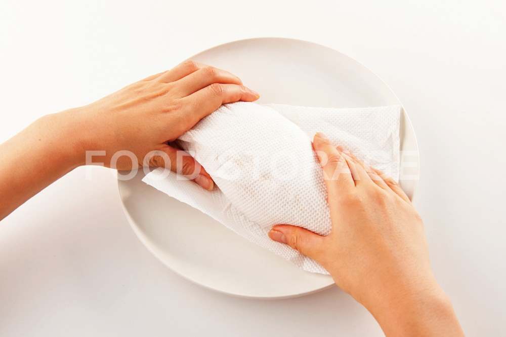 ペーパータオルで包んで両手で形を整える。同様にもう1人分を作り、ミニトマトを添えて好みでトマトケチャップをかける。 |