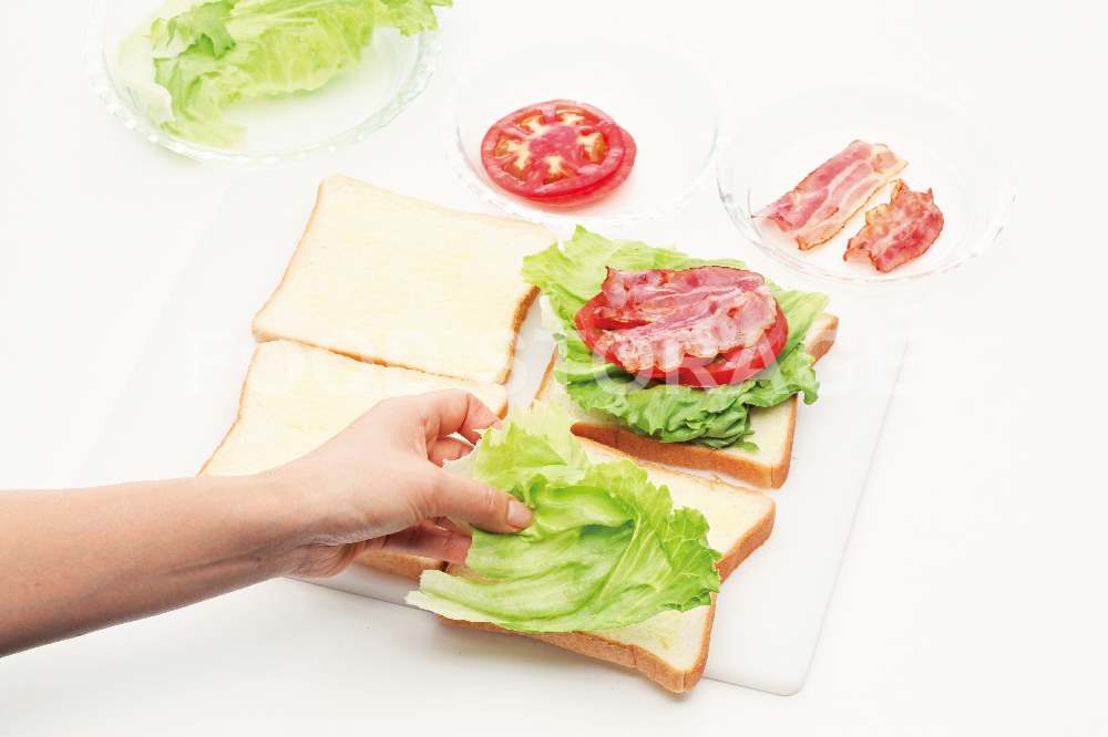 食パンの2枚の上に1のレタス、トマト、ベーコンの順にのせ、塩、こしょうをふって食パンを重ねる。 |