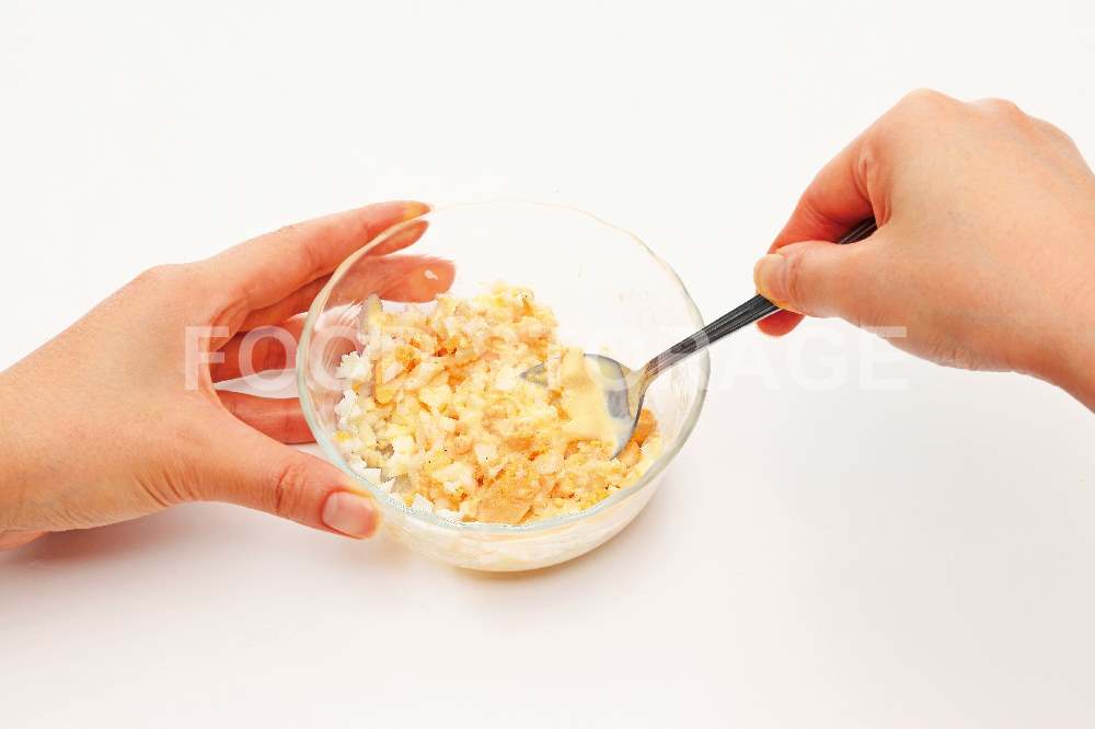 ゆで卵は粗みじん切りにし、ボウルに入れてマヨネーズ塩、こしょうで味を調える。 |