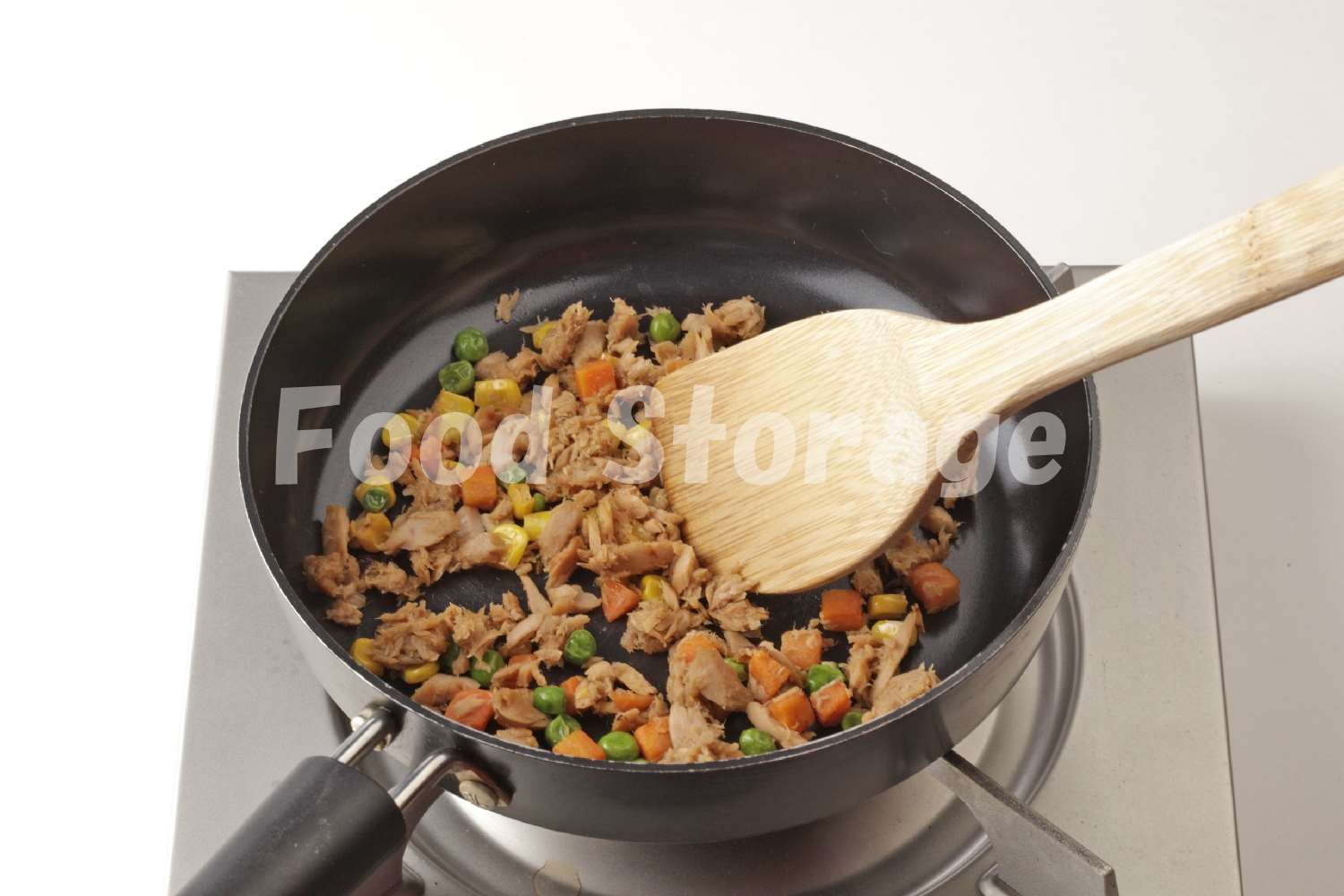 1 ツナは缶汁をきってフライパンに入れ、ミックスベジタブル、Aを加えて中火にかける。