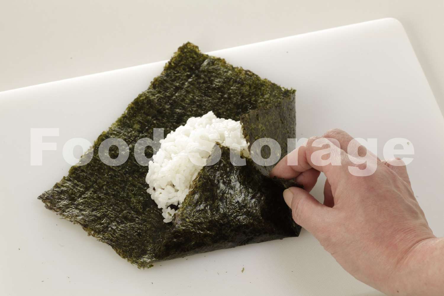 2 乗りの中心に半量のごはんをのせ、①、昆布佃煮を交互にのせて残りのごはんをのせる。のりの四つ角を合わせるようにたたんで包む。