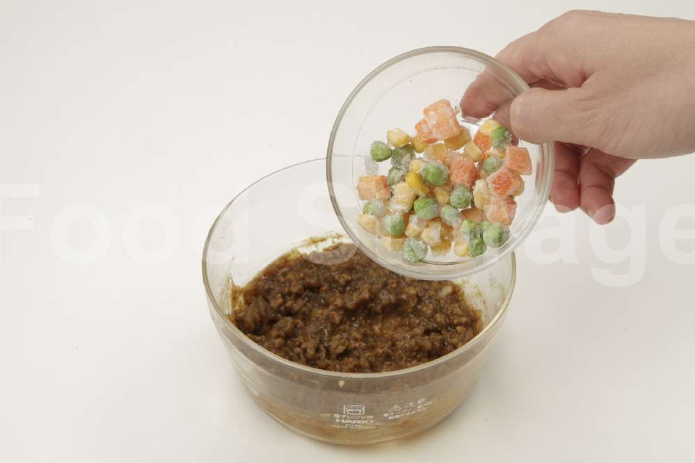 1 玉ねぎ、カレールウはみじん切りにし、ひき肉と耐熱容器に入れ、水を加えて混ぜ、ラップをして電子レンジで約1分30秒加熱し、一度取り出す。ミックスベジタブルを凍ったまま加えて混ぜ、再びラップをして電子レンジで約30秒加熱する。