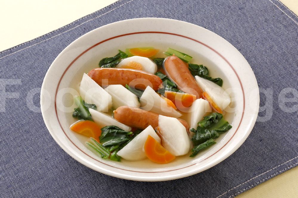 鍋ににんじん、Aを入れて煮立たせ、かぶ、小松菜、ウインナーを加えて中火で約2分煮る。 |
