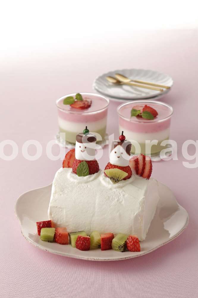 Aは8分立てにし、ロールケーキに塗って②をのせる。お内裏様にはミントの葉、お雛様にはキウイを飾る。