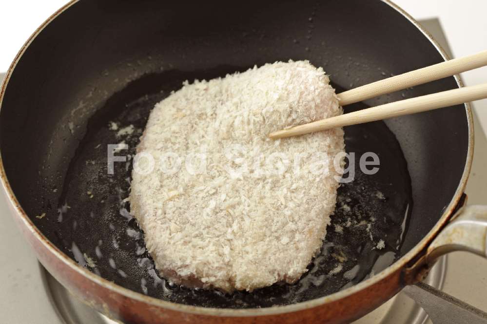 1 豚肉は塩、こしょうをふり、合わせたAにくぐらせてパン粉をまぶしつける。