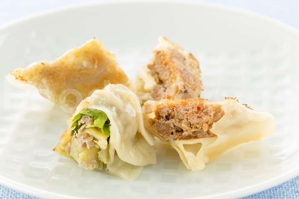 熱したホットプレートに油を入れ、②、③を並べて湯3/4カップ(材料外)を加え、ふたをして蒸し焼きにし、水毛が飛んで火が通ったらふたを取ってカリッと焼きあげる。※お好みでしょうゆ、酢、ラー油をつけていただく。 |