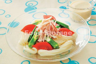 | 鶏肉と夏野菜の豆乳だれそうめん |