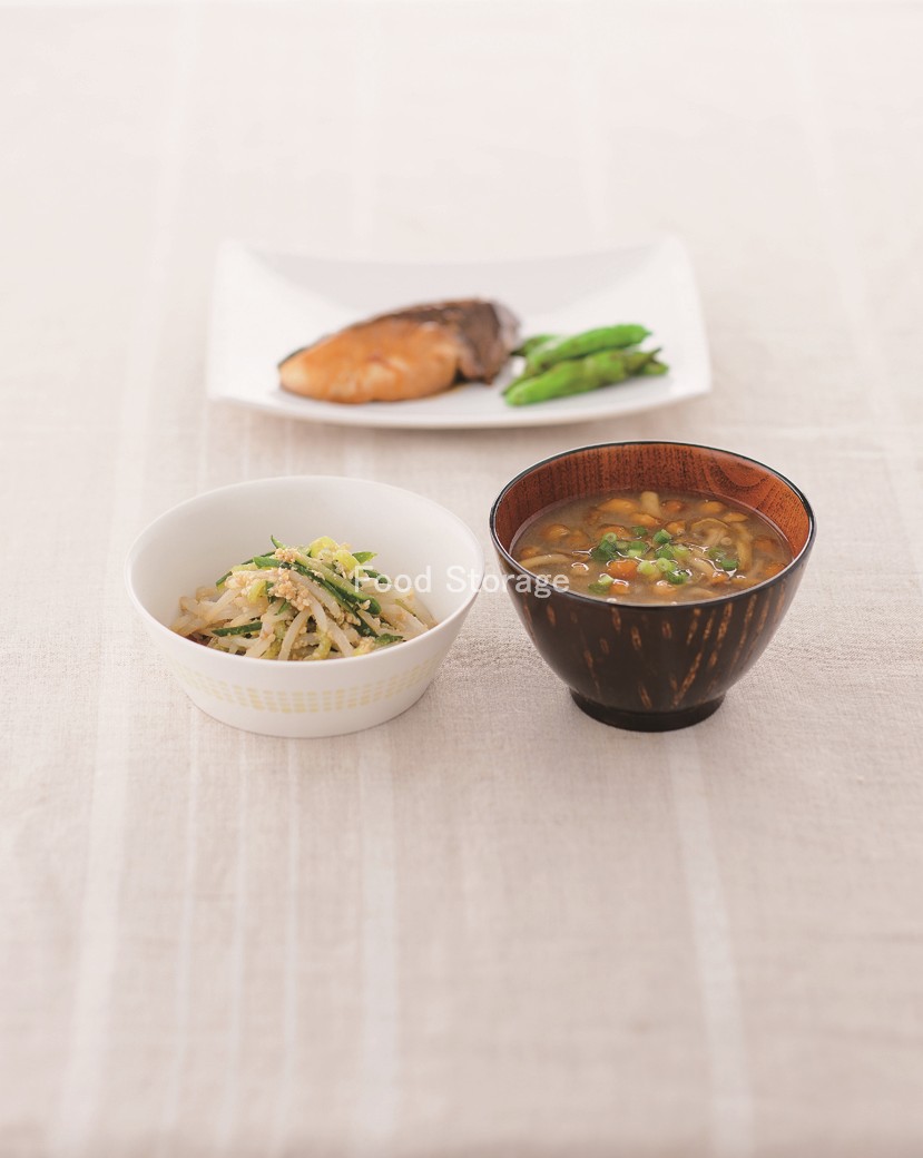 | 【ぶりの照り焼きに合う献立】きゅうりともやしのごま酢あえ+なめこのみそ汁 |