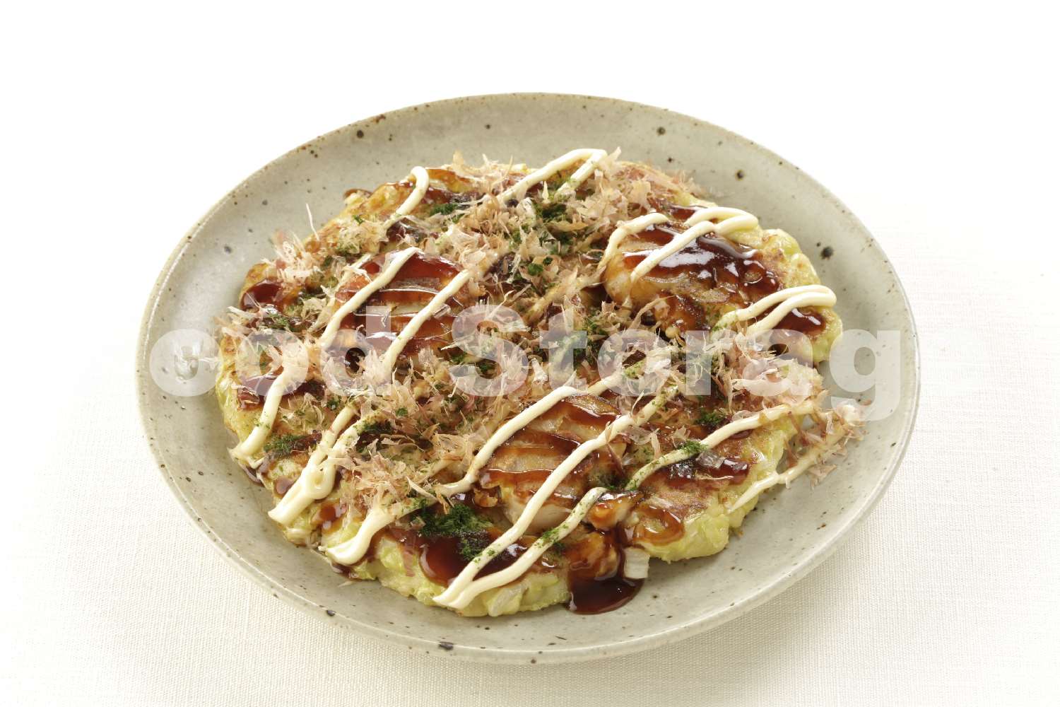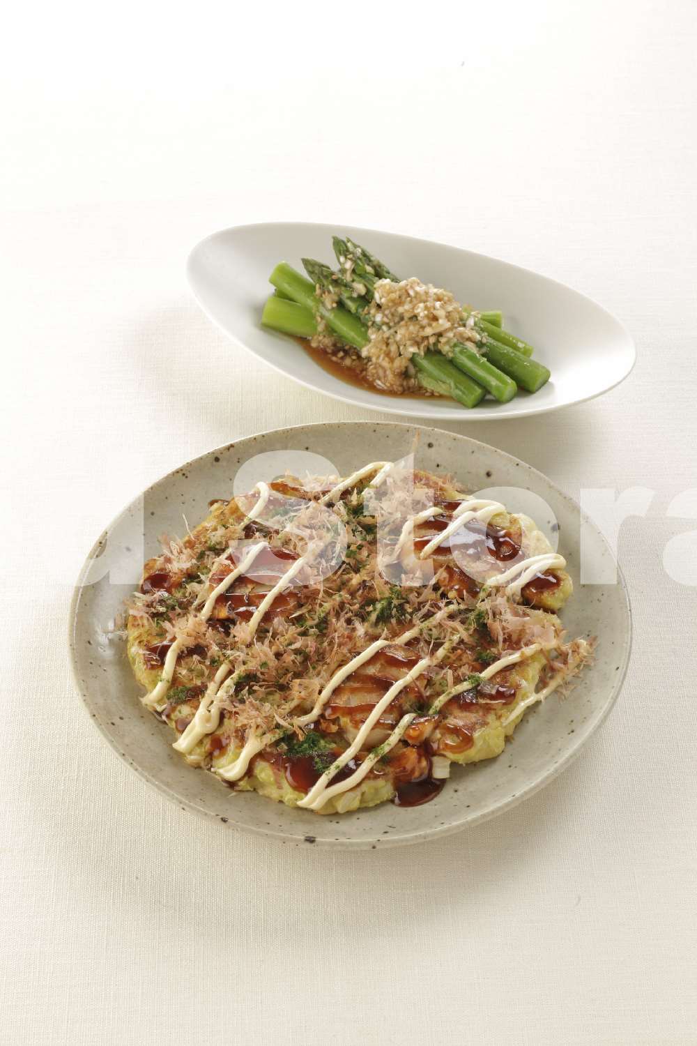 | 【献立】ほたてのお好み焼き+アスパラの香味野菜だれがけ |