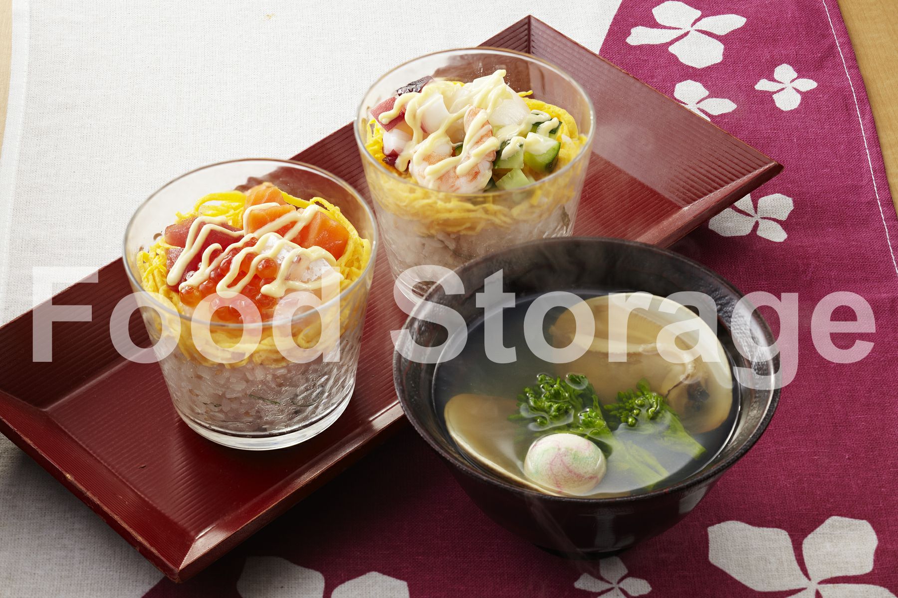 | グラスで海鮮ちらし、はまぐりのお吸い物の献立 |