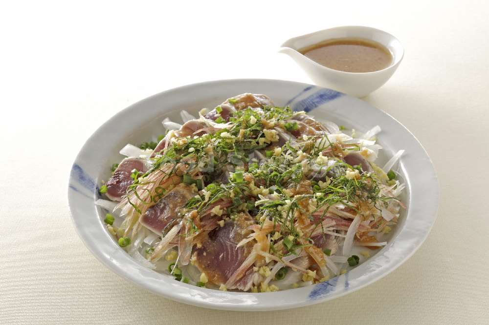 | オニオンスライスのかつおのたたきのせ 万能酢みそだれがけ |