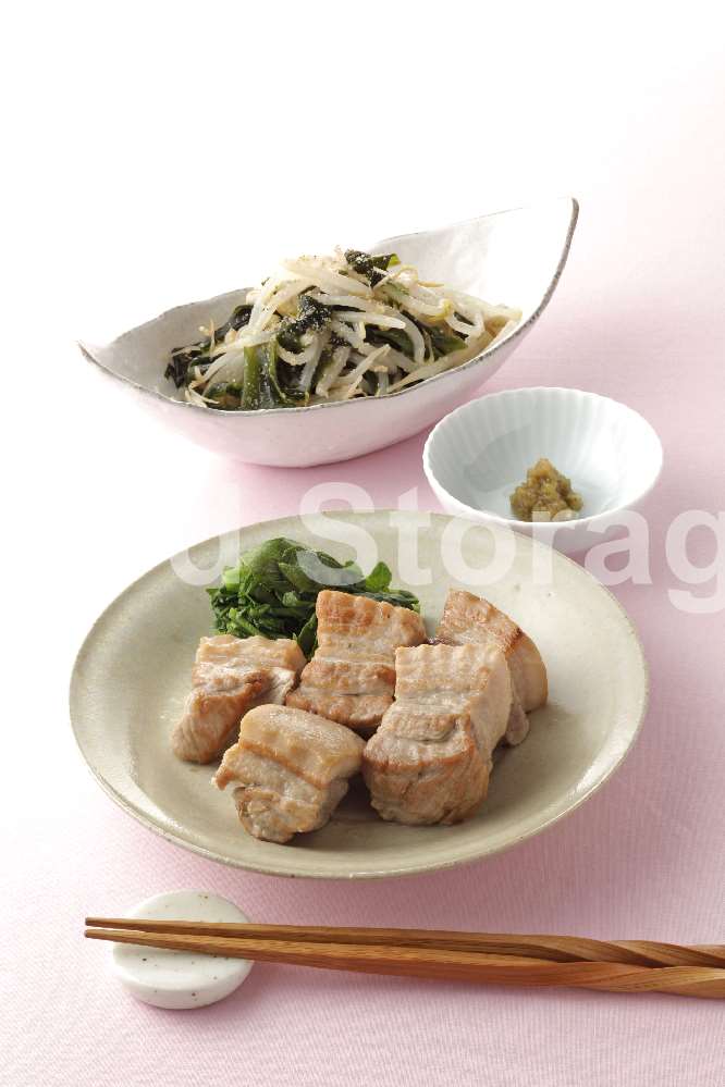 | 【献立】豚肉の塩角煮+わかめともやしのごまナムル |