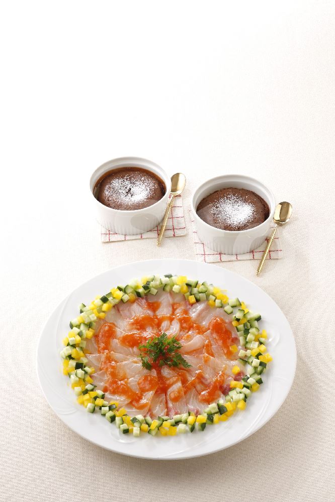 | 【献立】鯛のトマトカルパッチョ+ラム酒入りフォンダンショコラ |
