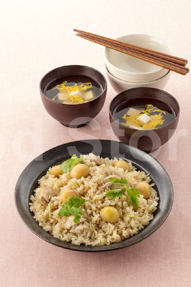| 【献立】栗と鶏肉の炊き込みごはん+菊と豆腐のあっさりお吸い物(web画像のみ) |