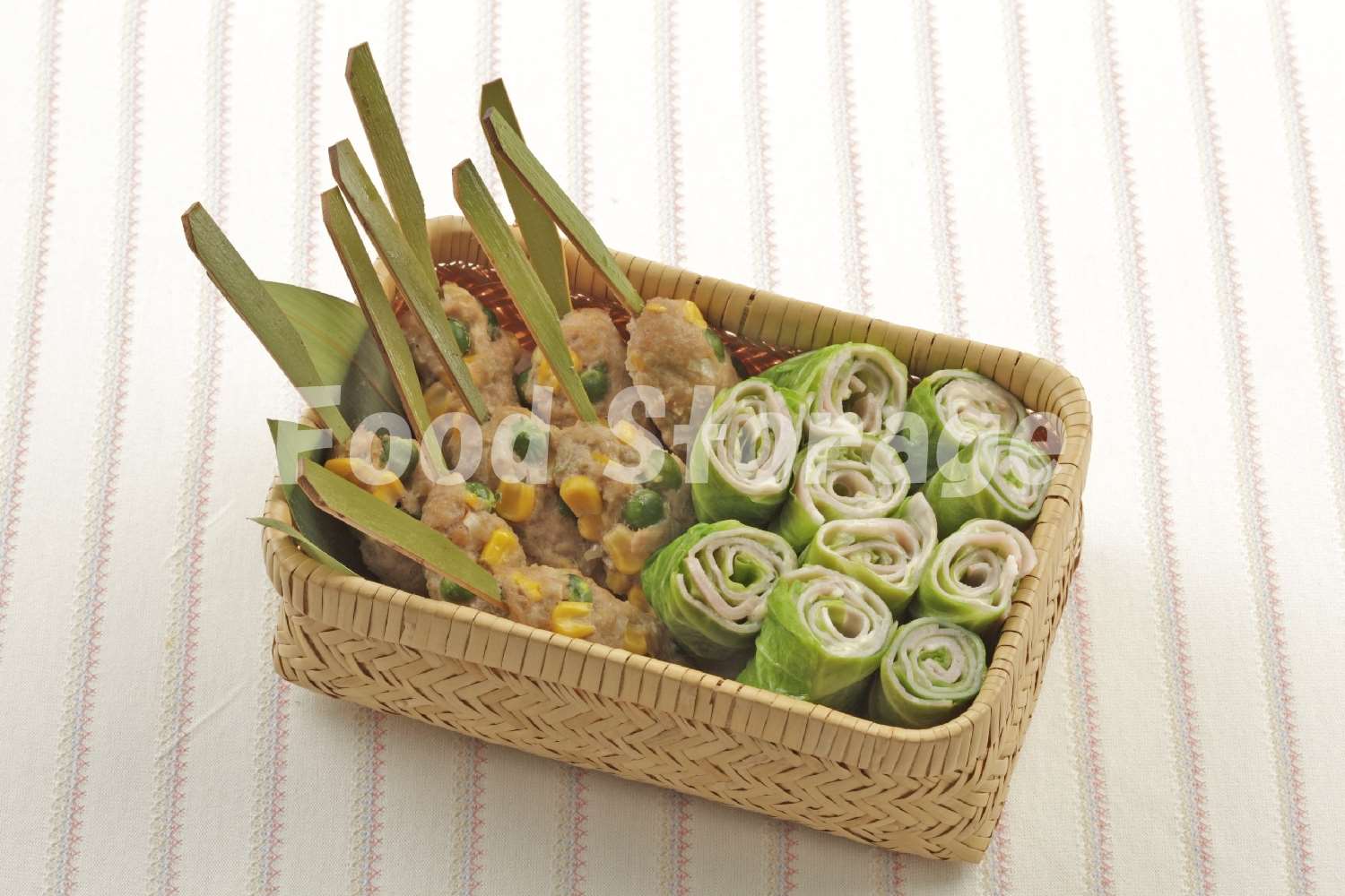 | 【お弁当】ポーク棒つくね&ハムのロールキャベツ |