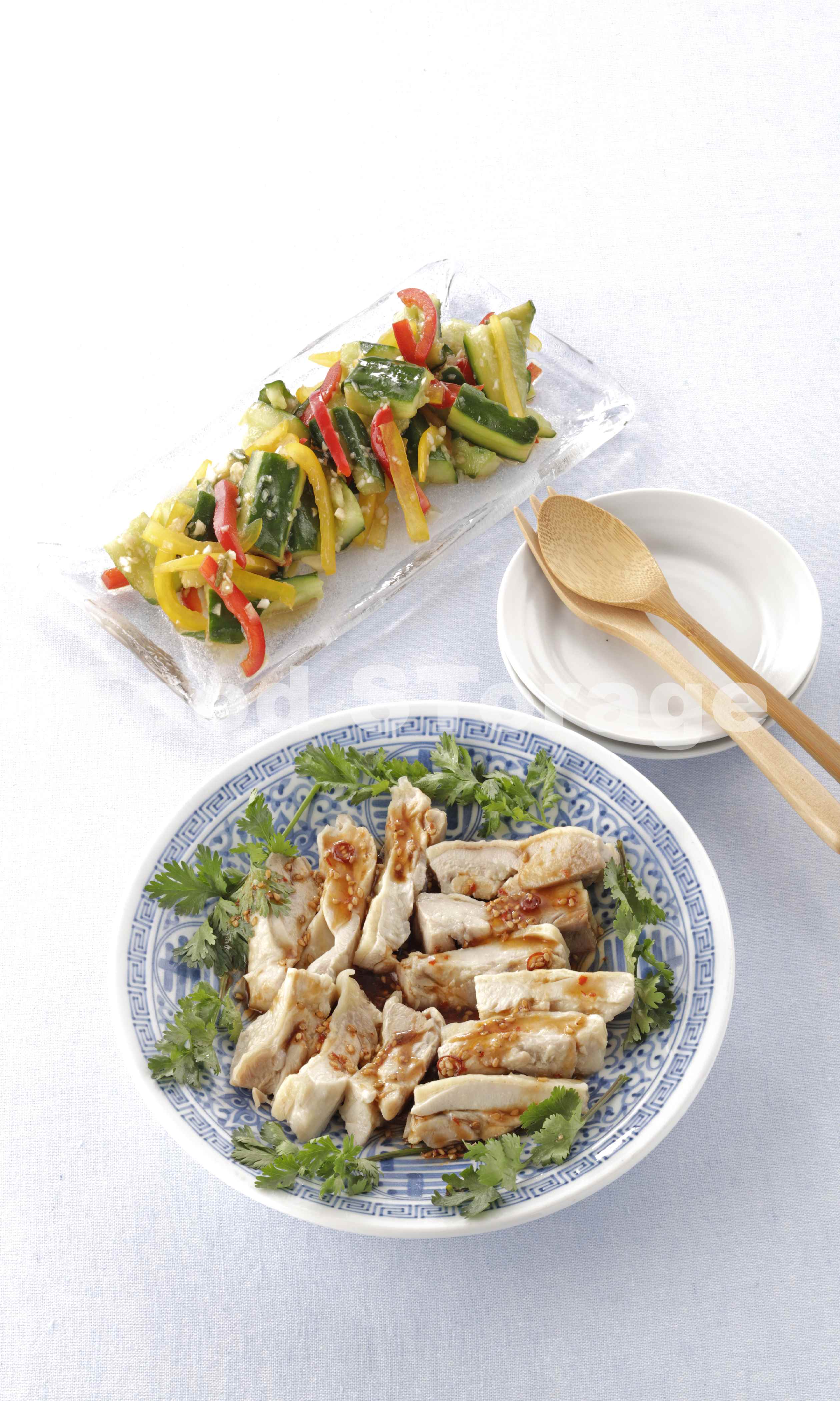 | 【献立】蒸し鶏の四川風ピリ辛だれ+きゅうりとパプリカの中華甘酢あえ |