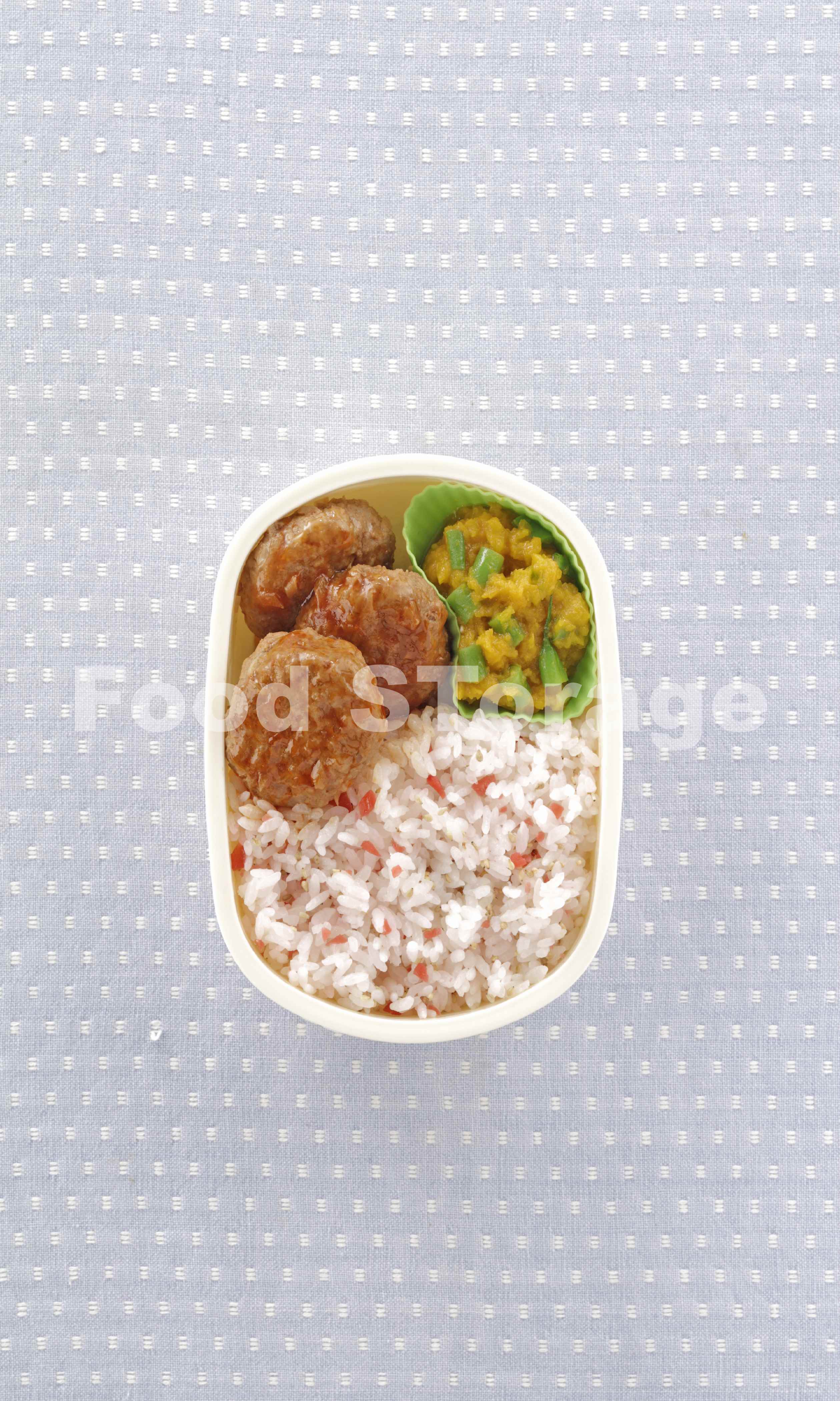 | 【お弁当】レンチン煮込みミニハンバーグ+かぼちゃといんげんのサラダ+カリカリ梅ごはん |