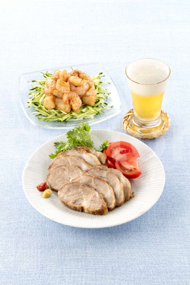 | 【献立】レンチンこっくりみそチャーシュー+ほたてと赤えびのあえもの風サラダ(web画像のみ) |