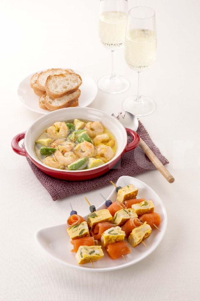 | 【献立】えびとアボカドのレモンアヒージョ+スモークサーモンとスペイン風オムレツのピンチョス |