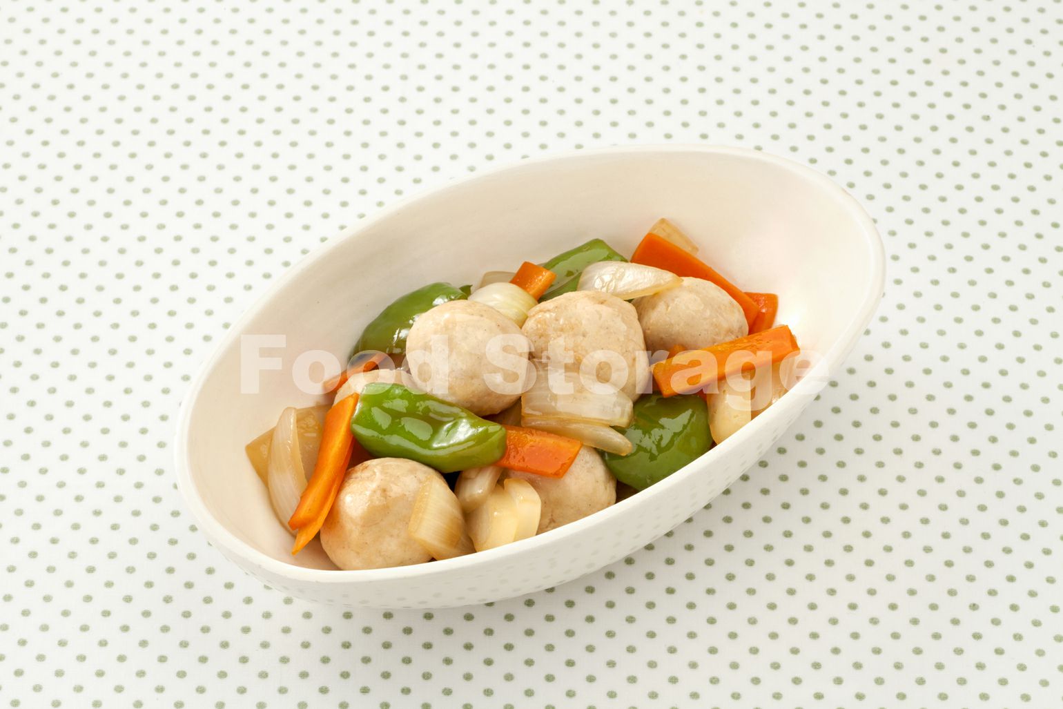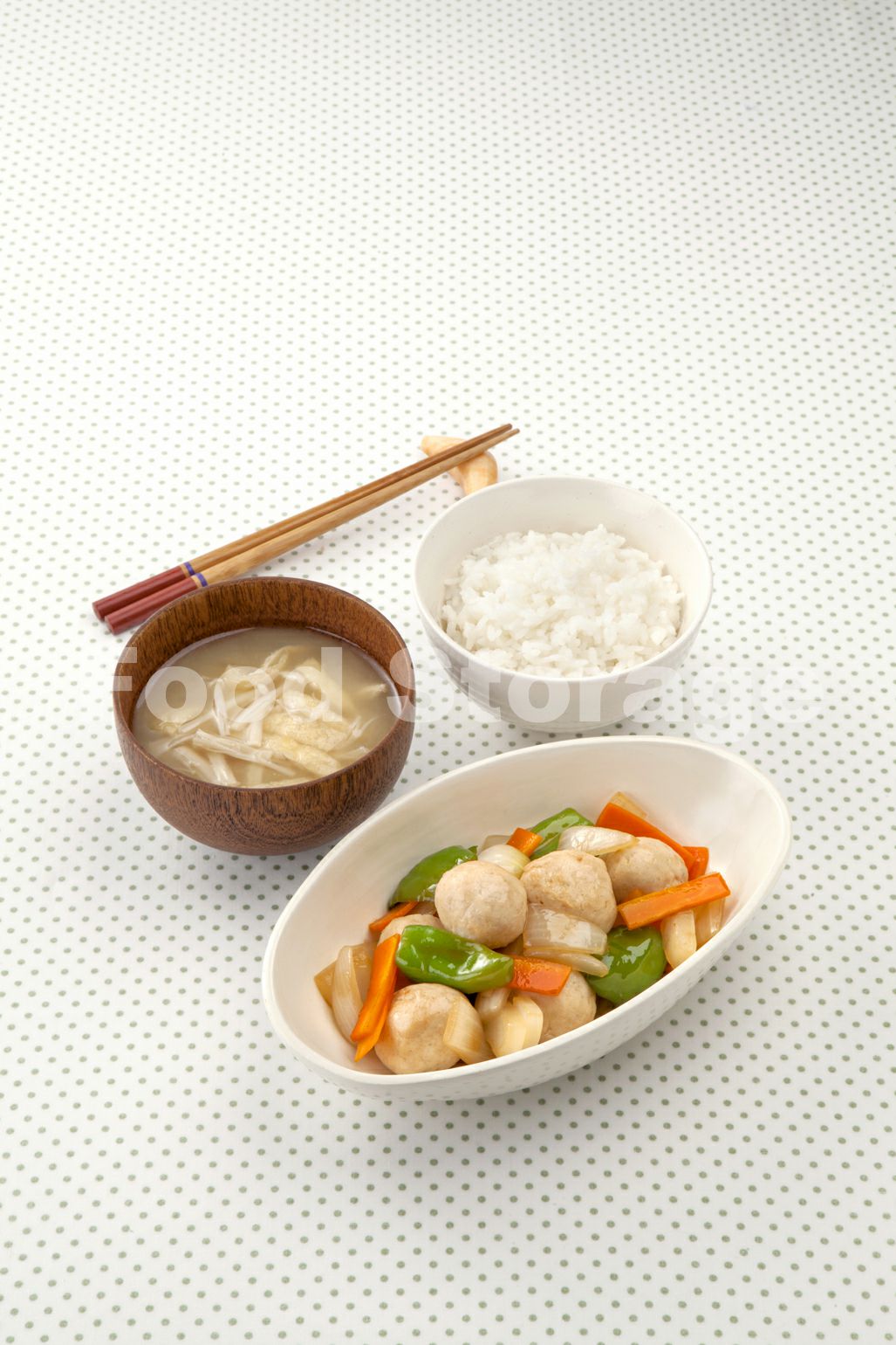 | 【献立】肉団子と野菜の甘酢炒め+えのきと油揚げのみそ汁 |