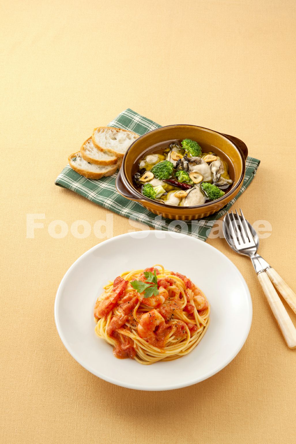 | 【献立】えびのトマトクリームパスタ+かきのアヒージョ |
