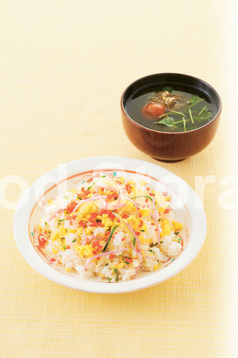 | いり卵とハムの混ぜずし+とろろ昆布と梅干しのお吸い物 |