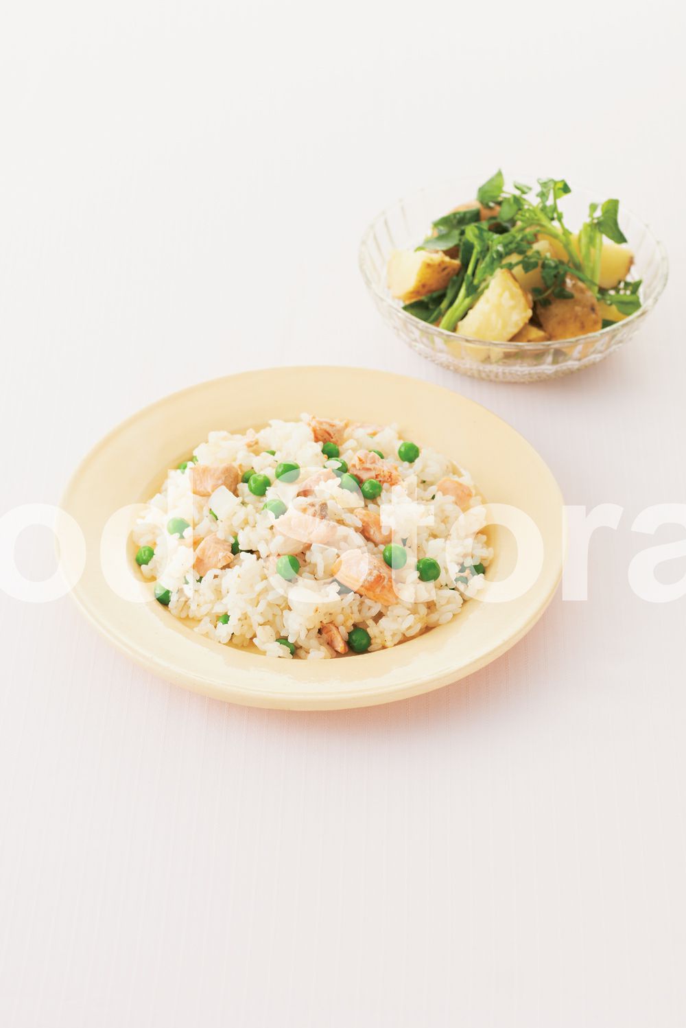 | 春野菜とサーモンピラフ+新じゃがとクレソンのサラダの献立 |
