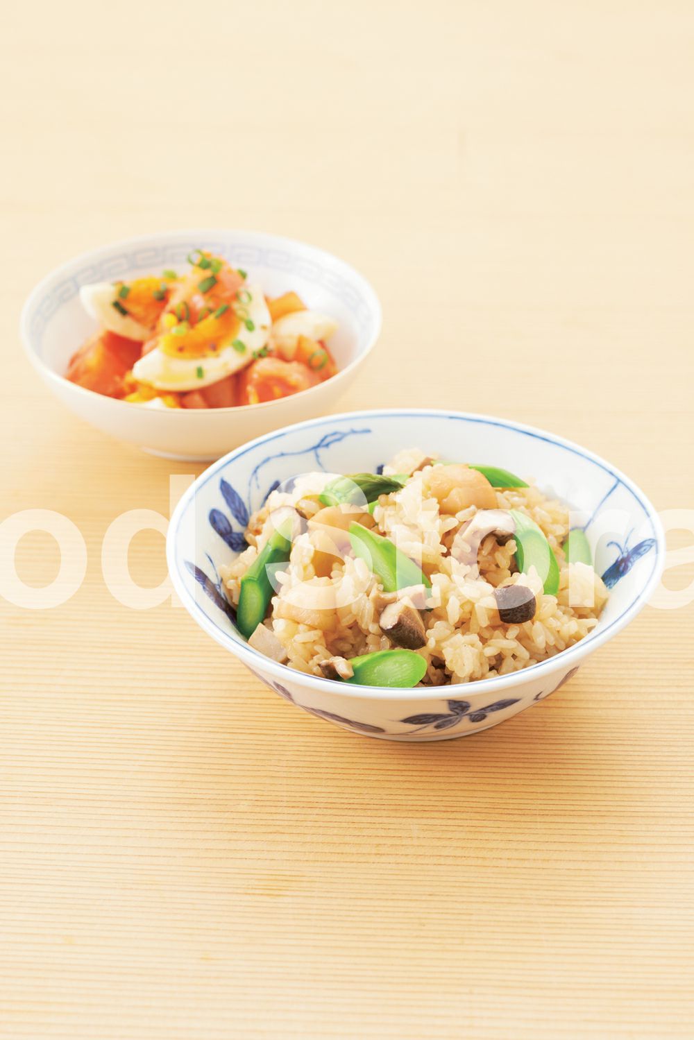 | アスパラと生ほたての中華おこわ+ゆで卵とトマトの中華あえの献立 |