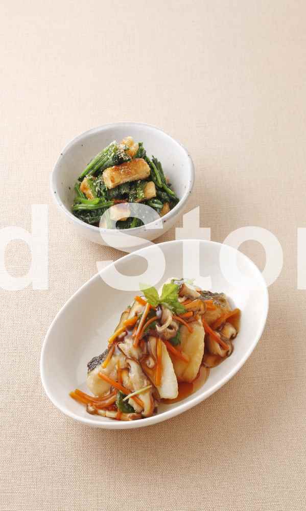 | 【献立】たらの唐揚げ 野菜あんかけ+ほうれん草と油揚げのごまポンあえ |