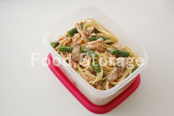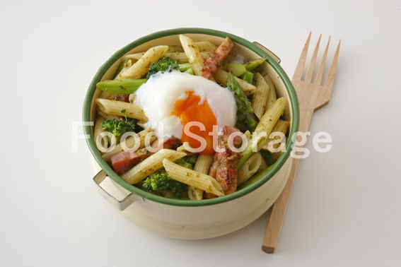 | 緑の野菜と温泉卵のパスタべんとう |