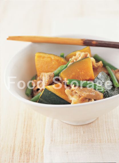 | かぼちゃといんげん、豚肉の煮物 |