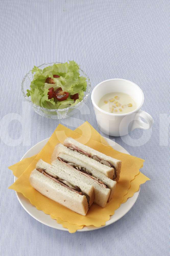| 【朝ごはん】炒めベーコンときのこのサンド(+サラダ、コーンスープ) |