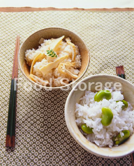 | 春の炊き込みごはん二種(そら豆、たけのこと油揚げ) |
