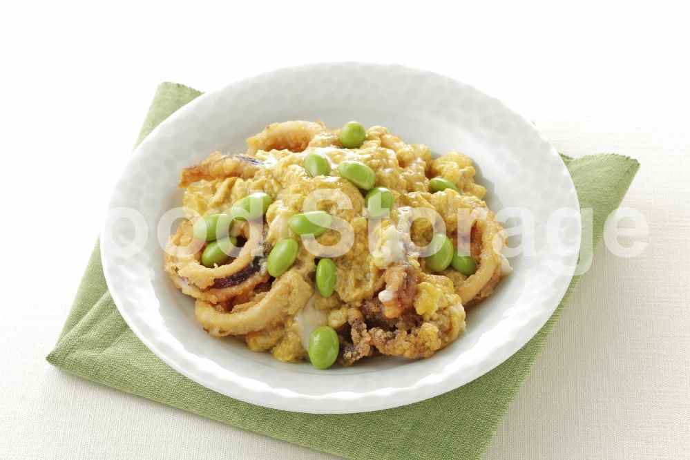 | いかの唐揚げと枝豆の卵とじ |
