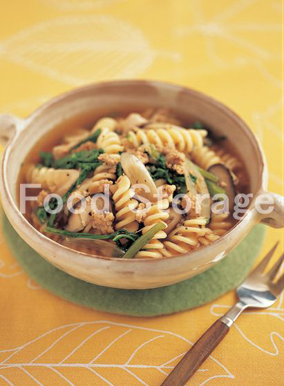 | 鶏ひき肉と春菊のスープパスタ |