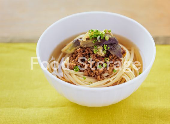 | ゆでなすと豚ひき肉のピリ辛ぶっかけパスタ |